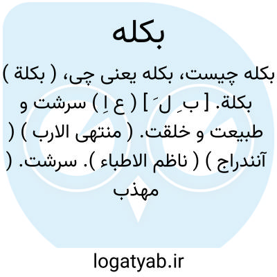 ( بکلة ) بکلة. [ ب ِ ل َ ] ( ع اِ ) سرشت و طبیعت و خلقت. ( منتهی الارب ) ( آنندراج ) ( ناظم الاطباء ). سرشت. ( مهذب الاسماء ). طبیعت. ( از اقرب الموارد ). || هیئت و صورت و حال. ( منتهی الارب ) ( ناظم الاطباء ) ( آنندراج ). هیئت.( از اقرب الموارد ). ج، بِکَل. ( از اقرب الموارد ).