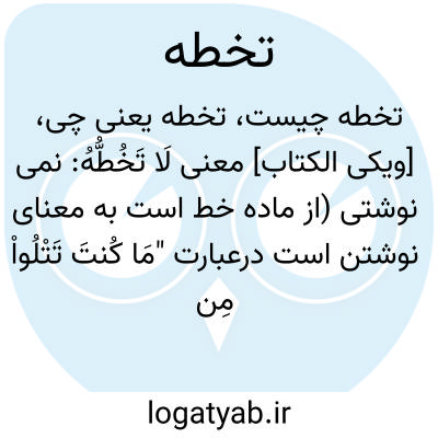 [ویکی الکتاب] معنی لَا تَخُطُّهُ: نمی نوشتی (از ماده خط است به معنای نوشتن است درعبارت "مَا کُنتَ تَتْلُواْ مِن قَبْلِهِ مِن کِتَابٍ وَلَا تَخُطُّهُ بِیَمِینِکَ " با ترکیب با "مَا کُنتَ"زمانش ماضی استمراری شده است )