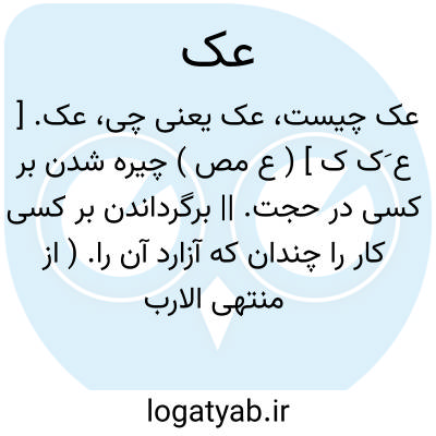 عک. [ ع َک ک ] ( ع مص ) چیره شدن بر کسی در حجت. || برگرداندن بر کسی کار را چندان که آزارد آن را. ( از منتهی الارب ) ( از اقرب الموارد ). || به تازیانه زدن. ( از منتهی الارب ) ( المصادر زوزنی ) ( از اقرب الموارد ). || میل کردن و حمله آوردن. || دوباره گفتن سخن را. ( از منتهی الارب ). سخنی را با کسی گفتن، و دوباره و سه باره تکرار خواستن آنرا. ( از اقرب الموارد ). || دیر نمودن در ادای حق کسی. ( از منتهی الارب ). سهل انگاری کردن در حق کسی. ( از اقرب الموارد ). || باربار بدی کردن به کسی. ( از منتهی الارب ) مکرر کردن بدی بر کسی. ( از اقرب الموارد ). || بند کردن، و بازداشتن از حاجت کسی را. ( از منتهی الارب ). بازداشتن. ( المصادر زوزنی ). منصرف کردن کسی را از حاجتش و منع کردن او را. ( از اقرب الموارد ). || بیان کردن کلام را. ( از منتهی الارب ). تفسیر کردن سخن را. ( از اقرب الموارد ). || گرم دائم شدن، و گرم گردیدن تب. ( از منتهی الارب ). ملازم گشتن تب کسی را و گرم کردن او را، تا لاغر شود. ( از اقرب الموارد ). || گرم شدن روز. ( از منتهی الارب ) ( از اقرب الموارد ). || تغییر یافتن رنگ ماده شتر به رنگی دیگر به سبب فربهی. || رد کردن سخن را بر کسی، از ناپایداری. || بجوش آمدن از گرما و حرارت. ( از اقرب الموارد ).