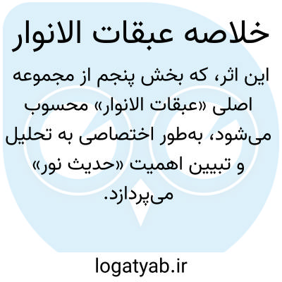 کتاب «خلاصه عبقات الأنوار فی إمامة الأئمة الأطهار» که تلخیصی از اثر عظیم میر حامد حسین هندی کنتوری لکهنوی است، توسط حجتالاسلام سید علی حسینی میلانی گزینش و تدوین شده و ترجمه فارسی آن به قلم سید حسن افتخارزاده منتشر گردیده است. این اثر، که بخش پنجم از مجموعه اصلی «عبقات الأنوار» محسوب میشود، بهطور اختصاصی به تحلیل و تبیین اهمیت «حدیث نور» میپردازد. نویسنده تأکید میکند که هرچند این حدیث نسبت به سایر روایات مربوط به مسئله امامت شهرت کمتری دارد و کمتر مورد استدلال قرار گرفته است، اما از حیث دلالت، چه صراحت و چه دلالت التزامی بر امامت حضرت علی (ع)، امتیازی ویژه داشته و جایگاه آن کمتر از احادیث مشهور دیگر نیست.