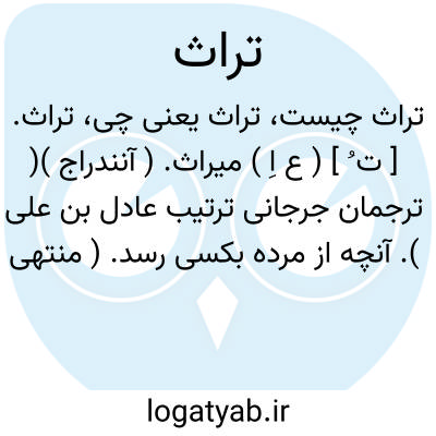 تراث. [ ت ُ ] ( ع اِ ) میراث. ( آنندراج )( ترجمان جرجانی ترتیب عادل بن علی ). آنچه از مرده بکسی رسد. ( منتهی الارب ) ( المنجد ) ( ناظم الاطباء ). و اصل التاء فیه واو. ( منتهی الارب ). ترکه میّت. مرده ریگ.