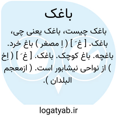 باغک. [ غ َ ] ( اِخ ) از نواحی نیشابور است. ( ازمعجم البلدان ). نام محله ای است از نیشابور. ( مرآت البلدان ج 1 ص 161 ). از محال نیشابور. ( مراصدالاطلاع ).
