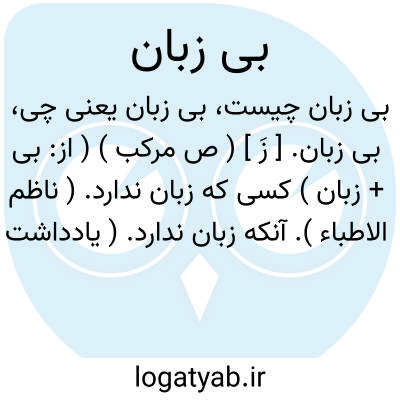 بی زبان. [ زَ ] ( ص مرکب ) ( از: بی + زبان ) کسی که زبان ندارد. ( ناظم الاطباء ). آنکه زبان ندارد. ( یادداشت مؤلف ). که سخن گفتن نتواند. || حیوان که صفت ناطقی ندارد. غیرناطق. و این صفت درباره حیوان گاه جلب ِ عطوفت یا ترحم یا حمایت بکار رود: