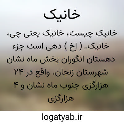 خانیک. ( اِخ ) دهی است جزء دهستان انگوران بخش ماه نشان شهرستان زنجان. واقع در 24 هزارگزی جنوب ماه نشان و 4 هزارگزی راه مالرو عمومی، این ده در منطقه ٔکوهستانی قرار دارد و هوایش سرد است. اهالی آن 303 تن اند که زبانشان ترکی و مذهبشان شیعه است. آب آنجا از رودخانه مراش و محصول آن غلات و انگور و قیسی وقلمستان و شغل اهالی زراعت و گلیم و جاجیم بافی و راه آنجا مالرو است. ( از فرهنگ جغرافیایی ایران ج 2 ).