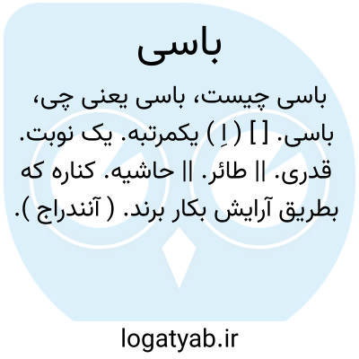 باسی. [ ] ( اِ ) یکمرتبه. یک نوبت. قدری. || طائر. || حاشیه. کناره که بطریق آرایش بکار برند. ( آنندراج ).