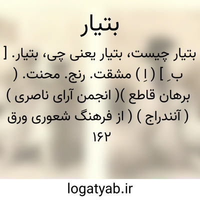 بتیار. [ ب ِ ] ( اِ ) مشقت. رنج. محنت. ( برهان قاطع )( انجمن آرای ناصری ) ( آنندراج ) ( از فرهنگ شعوری ورق 162 ). درد. پتیاره. ( فرهنگ فارسی معین ):