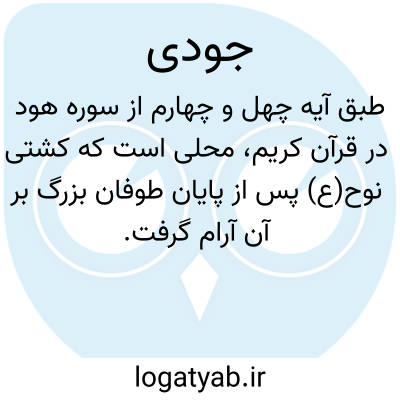 [ویکی فقه] جودی (قرآن). جودی نام کوهی است، که کشتی نوح پس از پایان طوفان، بر فراز آن به گِل نشست.