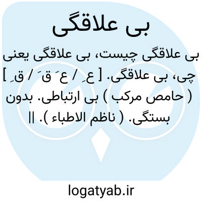بی علاقگی. [ ع ِ / ع َ ق َ / ق ِ ] ( حامص مرکب ) بی ارتباطی. بدون بستگی. ( ناظم الاطباء ). || بی میلی. بی مهری.
