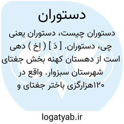 دستوران. [ دَ ] ( اِخ ) دهی است از دهستان کهنه بخش جغتای شهرستان سبزوار. واقع در 120هزارگزی باختر جغتای و کنار راه مالرو عمومی جغتای به شریف آباد، با 409 تن سکنه. آب آن از قنات و راه آن مالرو است. ( از فرهنگ جغرافیائی ایران ج 9 ).