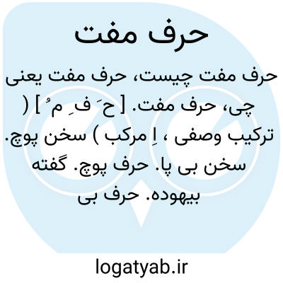 حرف مفت. [ ح َ ف ِ م ُ ] ( ترکیب وصفی، اِ مرکب ) سخن پوچ. سخن بی پا. حرف پوچ. گفته بیهوده. حرف بی هوده. حرف بی ارزش. || بی ارزش از هر چیز که باشد.