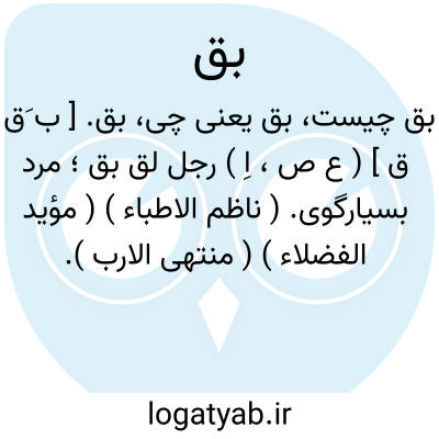 بق. [ ب َق ق ] ( ع ص، اِ ) رجل لق بق؛ مرد بسیارگوی. ( ناظم الاطباء ) ( مؤید الفضلاء ) ( منتهی الارب ). رجل لق بق، مثل لقلاق بقباق؛ یعنی مکثار و پرگوی. ( از اقرب الموارد ). و رجوع به بقباق شود. || سختی. || پیکر. ( مؤید الفضلاء ). || ج ِ بقة. ( ناظم الاطباء ) ( منتهی الارب ). یکی آن: بقة. ( از اقرب الموارد ). رجوع به بقة شود. || بق الحیطان؛ ساس. ( ناظم الاطباء ). || پشه که از حشرات پردار است. ( فرهنگ نظام ). پشه، گاهی در فارسی بضرورت نظم بتخفیف می آرند. ( آنندراج ) ( غیاث ). پشه بزرگ. الواحد، بقة. ج، بقون. ( مهذب الاسماء ). بعوض. ( دزی ج 1 ص 102 ). بعوض. ناموس. فسافس. ( تذکره داود ضریر انطاکی ). و رجوع به همان متن شود. بعربی ناموس و بفارسی پشه و بهندی مچهر نامند و اهل مصر و یمن و حجاز کَتّان و اهل عمان و بحرین و لحسا و قطیف ضَمْج ْ گویند. ( مخزن الادویه ):