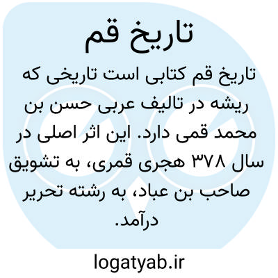 کتابی تاریخی به فارسی که در سال های ۸۰۵ ـ۸۰۶ق از زبان عربی ترجمه شده است. اصل کتاب را حسن بن محمد قمی در ۳۷۸ق به تشویق صاحب بن عبّاد در بیست باب نوشت ولی آنچه از این ترجمه برجای مانده، شامل پنج باب نخست تاریخ قم است که مطالبی در باب خصوصیات جغرافیایی و تاریخی شهر قم و ورود مسلمانان به آن شهر و اشاعرۀ آنجا دارد. نثر ترجمه ساده و روان است و اطلاعات ارزشمندی در زمینۀ شهرنشینی، زمین داری، تقسیم آب، احکام خراج، و روابط ارباب ـ رعیتی در ایران پس از اسلام دارد. سیدجلال الدین تهرانی در ۱۳۱۳ش آن را تصحیح و به چاپ رساند.