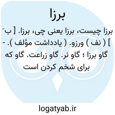 - گاو برزا؛ گاو نر. گاو زراعت. گاو که برای شخم کردن است: بگیرند شحم حنظل و بوره از هریکی دودانگ، ماذریون و نشادر از هریکی دانگی همه را به زهره گاو برزا بسرشند. ( ذخیره خوارزمشاهی ). با روغن زیت کهن با زهره گاو برزا بکام و زبان بمالند.