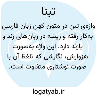 تبنا. [ ت َ ] ( هزوارش، اِ ) بلغت زند و پازند کاهی که از گندم و جو بهم میرسد. ( برهان ) ( انجمن آرا )( آنندراج ). بلغت زند و پازند کاه گندم و جو و جز آن. ( ناظم الاطباء ). و به عربی تبن میگویند. ( برهان ).