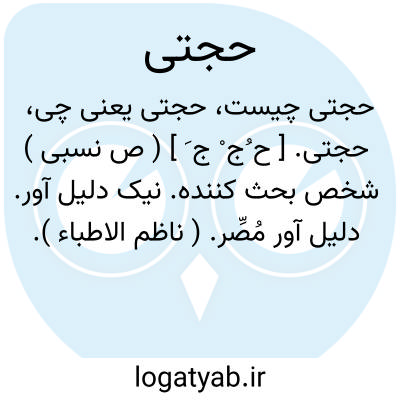 حجتی. [ ح ُج ْ ج َ ] ( ص نسبی ) شخص بحث کننده. نیک دلیل آور. دلیل آور مُصِّر. ( ناظم الاطباء ).