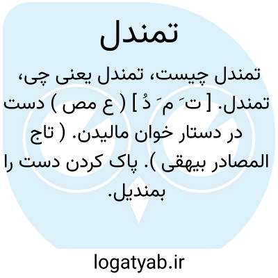 تمندل. [ ت َ م َ دُ ] ( ع مص ) دست در دستار خوان مالیدن. ( تاج المصادر بیهقی ). پاک کردن دست را بمندیل. ( منتهی الارب ) ( ناظم الاطباء ). تندل. تمسح. ( اقرب الموارد ). خشک کردن روی را با رومال و امثال آن. ( یادداشت به خط مرحوم دهخدا ): انما کره التمندل بعد الوضوء لان کل قطرة توزن. ( تاریخ اصفهان ابونعیم ج 1 ص 240، یادداشت ایضاً ). || دستار در سربستن. ( تاج المصادر بیهقی ). دستار بر میان بستن. ( منتهی الارب ) ( ناظم الاطباء ). و کسائی آرد: تندل بالمندیل وتمندل، اذا شده برأسه و اعتم به. ( اقرب الموارد ). یعنی استوار کردن مندیل بر سر و عمامه بستن بر آن.