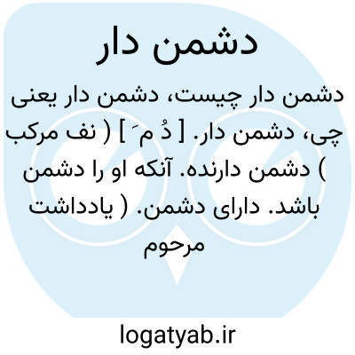 دشمن دار. [ دُ م َ ] ( نف مرکب ) دشمن دارنده. آنکه او را دشمن باشد. دارای دشمن. ( یادداشت مرحوم دهخدا ). || که دشمن گیرد. که دیگری را دشمن شمرد. مبغض. دشمن. عدو. ( یادداشت مرحوم دهخدا ). مقابل دوست دار. یعنی آنکه هم مراد دشمنان باشد. ( آنندراج ):