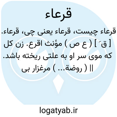 قرعاء. [ ق َ ] ( ع ص ) مؤنث اقرع. زن کل که موی سر او به علتی ریخته باشد. || ( روضة... ) مرغزار بی گیاه. ( منتهی الارب ). رجوع به اقرع شود. || انگشت تباه. ( منتهی الارب ) ( اقرب الموارد ). || ( اِ ) سختی و بلا. ( منتهی الارب ) ( اقرب الموارد ). قرع. ( منتهی الارب ). || صحن خانه. || برسوی راه. ( منتهی الارب ) ( اقرب الموارد ).