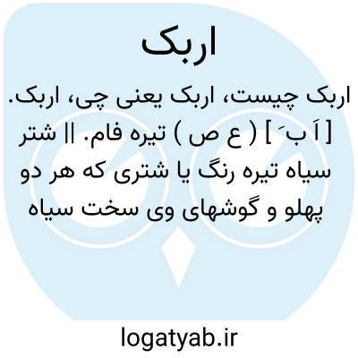 اربک. [ اَ ب َ ] ( ع ص ) تیره فام. || شتر سیاه تیره رنگ یا شتری که هر دو پهلو و گوشهای وی سخت سیاه و سوای آن تیره رنگ باشد. ج، رُبک. ( منتهی الارب ).