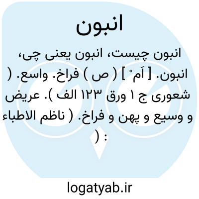 انبون. [ اَم ْ ] ( ص ) فراخ. واسع. ( شعوری ج 1 ورق 123 الف ). عریض و وسیع و پهن و فراخ. ( ناظم الاطباء ):