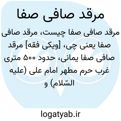 [ویکی فقه] مرقد صافی صفا یمانی، حدود ۵۰۰ متری غرب حرم مطهر امام علی (علیه السّلام) و در کنار بحر النجف واقع است و به «صفّة صافی صفا» نیز مشهور است.این مکان در حقیقت مقام امیرالمؤمنین (علیه السّلام) و بارگاه اثیب الیمانی معروف به «صافی صفا» بوده و از نمادها و آثار تاریخی شهر نجف اشرف به شمار می رود که تاریخ آنها به صدها سال پیش برمی گردد.اولین گنبد این بارگاه در قرن هشتم هجری بنا شد و تا سال ۱۰۴۴ هجری چندین بار مرمت و بازسازی گردید. از ۵۵۰ سال گذشته تا به امروز، پرده داری بارگاه با خاندادن آل الدروایش مخزومیه است.
