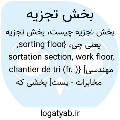 {sorting floor, sortation section, work floor, chantier de tri (fr. )} [مهندسی مخابرات - پست] بخشی که در آن عملیات تجزیۀ انواع مرسولات پُستی یا کیسه های پُستی و عملیات وابسته به آن انجام می شود