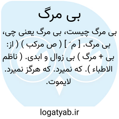 بی مرگ. [ م َ ] ( ص مرکب ) ( از: بی + مرگ ) بی زوال و ابدی. ( ناظم الاطباء ). که نمیرد. که هرگز نمیرد. لایموت. جاودانی. انوشه. ( یادداشت مؤلف ). || عالم بقا. ابدیت: