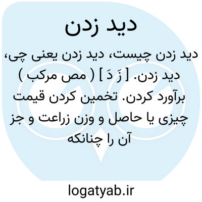 دید زدن. [ زَ دَ ] ( مص مرکب ) برآورد کردن. تخمین کردن قیمت چیزی یا حاصل و وزن زراعت و جز آن را چنانکه مثلاً گویند میوه امساله را ده خروار دید زده اند حرز. خرص کردن. تخمین کردن چنانکه خرج بنایی که ساختن آن خواهند. ( از یادداشت مؤلف ).
