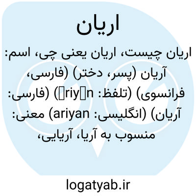 اسم: آریان (پسر، دختر) (فارسی، فرانسوی) (تلفظ: āriyān) (فارسی: آريان) (انگلیسی: ariyan)