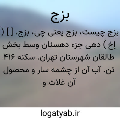 بزج. [ ] ( اِخ ) دهی جزء دهستان وسط بخش طالقان شهرستان تهران. سکنه 416 تن. آب آن از چشمه سار و محصول آن غلات و لبنیات و عسل است. شغل اهالی زراعت و گله داری و قالیچه و جاجیم و گلیم بافی. راه آن مالرو. ( از فرهنگجغرافیایی ایران ج 1 ).