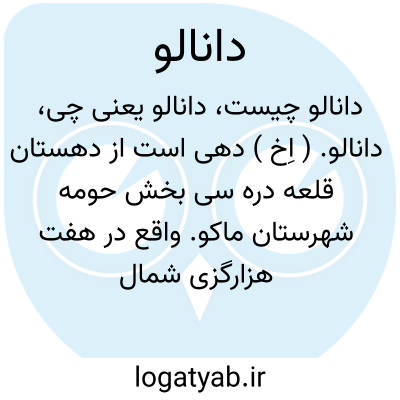 دانالو. ( اِخ ) دهی است از دهستان قلعه دره سی بخش حومه شهرستان ماکو. واقع در هفت هزارگزی شمال خاوری ماکو. دارای راه شوسه است. دره و معتدل و مالاریایی و 584 تن سکنه دارد. آب آن از رودخانه ساری سو و محصول آنجا غلات و حبوبات و بزرک و شغل مردم آن زراعت و گله داری و صنایع دستی آنجا جاجیم و جوراب بافی است و راه شوسه دارد. ( در دو محل نزدیک هم واقع است و بنام دانالوی بزرگ و دانالوی کوچک مشهور می باشد ). ( از فرهنگ جغرافیایی ایران ج 4 ).