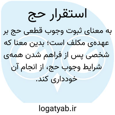 [ویکی حج] استقرار حج وجوب قطعی حج بر عهده مکلف با ترک حج پس ازفراهم شدن همه شرایط وجوب آن است که مستلزم احکام خاصی مانند انجام حج حتی در صورت فقدان شرایط و حتی مرگ مکلف ونیابت گرفتن از سوی اواست.