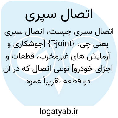 {T-joint} [جوشکاری و آزمایش های غیرمخرب، قطعات و اجزای خودرو] نوعی اتصال که در آن دو قطعه تقریباً عمود برهم و به شکل T قرار می گیرند