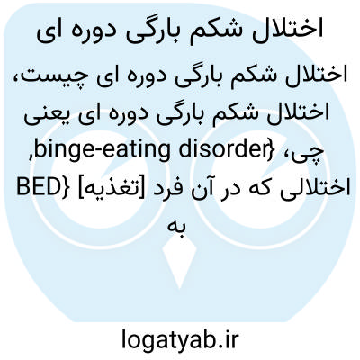 {binge-eating disorder, BED} [تغذیه] اختلالی که در آن فرد به صورت دوره ای، در فواصل زمانی کوتاه، به صورت تکراری، به مقدار بسیار زیاد و مهارنشده غذا مصرف می کند
