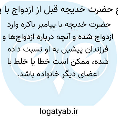 [ویکی فقه] اثبات فرزند یا فرزندانی برای حضرت خدیجه (سلام الله علیها) از همسری غیر از رسول خدا (صلی الله علیه و آله وسلّم) نه تنها امری غیرممکن؛ بلکه با توجه به نقل های تاریخی محال است؛ بنابراین ازدواج حضرت خدیجه قبل از رسول گرامی اسلام (صلی الله علیه و آله وسلّم) از موضوعات ساختگی است و یا لااقل بر اساس جهل و نادانی و تفسیر غلط از حوادث تاریخی رخ داده است که هر ناقد آگاهی را به این نتیجه می رساند.