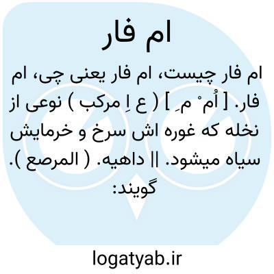 ام فار. [ اُم ْ م ِ ] ( ع اِ مرکب ) نوعی از نخله که غوره اش سرخ و خرمایش سیاه میشود. || داهیه. ( المرصع ). گویند: وقعوا فی ام فار؛ در داهیه واقع شدند. ( از المرصع ). در المرصع با الف و لام یعنی ام الفار نیز آمده.
