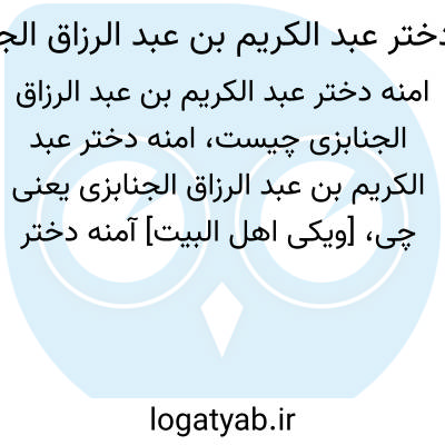 [ویکی اهل البیت] آمنه دختر عبد الکریم بن عبد الرزاق الجنابزی. آمنه، (محدث، متوفی قرن 6 ه) دختر عبد الکریم بن عبد الرزاق الجنابزی، محدثه ای از محدثات قرن 5 و 6 هجری در اصفهان.زنی بسیار با صلاح و دین دار بود.عبد الکریم بن محمد سمعانی از او اخذ حدیث کرده است.