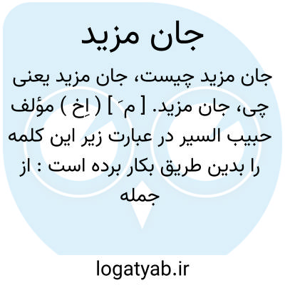 جان مزید. [ م َ ] ( اِخ ) مؤلف حبیب السیر در عبارت زیر این کلمه را بدین طریق بکار برده است: از جمله آنکه در مبادی احوال که مولانا عبدالرحیم از پشت دروازه خوش پایان آمده در منازل جان مزید، میرآخور که نزدیک بدروازه مذکور است منزل گزید. ( حبیب السیر چ خیام ج 4 ص 382 ). احتمال است اسم جایی بوده که ملک میرآخور باشد و نیز احتمال دارد اسم شخصی باشد.