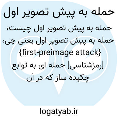 {first-preimage attack} [رمزشناسی] حمله ای به توابع چکیده ساز که در آن مهاجم با داشتن یک مقدار چکیده (hash value )، با کمتر از 2 به توان nبار اقدام، موفق به یافتن یک پیام با همان مقدار چکیده شود