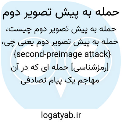{second-preimage attack} [رمزشناسی] حمله ای که در آن مهاجم یک پیام تصادفی انتخاب می کند و امیدوار است که چکیدۀ مفروضی به دست آورد