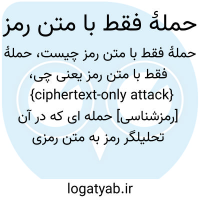 {ciphertext-only attack} [رمزشناسی] حمله ای که در آن تحلیلگر رمز به متن رمزی شدۀ شماری از پیام هایی دسترسی دارد که همگی با یک خوارزمی/ الگوریتم رمزگذاری (encryption ) شده اند
