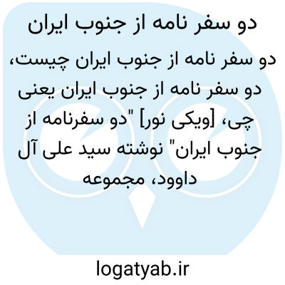 [ویکی فقه] دو سفرنامه از جنوب ایران (کتاب). دو سفرنامه از جنوب ایران نوشته سید علی آل داوود، مجموعه ای است شامل دو سفرنامه درباره جغرافیای طبیعی، راه ها و فواصل شهرها و روستاها، جغرافیای انسانی و اقتصادی صفحات مرکزی و جنوبی ایران در عصر قاجار.