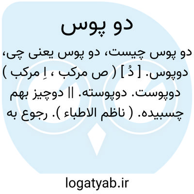 لغت نامه دهخدا دوپوس. [ دُ ] ( ص مرکب، اِ مرکب ) دوپوست. دوپوسته. || دوچیز بهم چسبیده. ( ناظم الاطباء ). رجوع به دوپوست و دو پوسته شود.