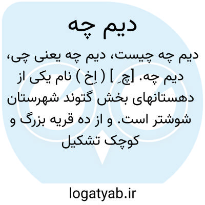 دیم چه. [چ ِ ] ( اِخ ) نام یکی از دهستانهای بخش گتوند شهرستان شوشتر است. و از ده قریه بزرگ و کوچک تشکیل شده و 1300 تن سکنه دارد. ( از فرهنگ جغرافیائی ایران ج 6 ).