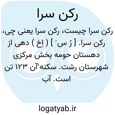 رکن سرا. [ رُ س َ ] ( اِخ ) دهی از دهستان حومه بخش مرکزی شهرستان رشت. سکنه ٔآن 123 تن است. آب آن از خمام رود. محصول عمده آنجابرنج و صیفی است. ( از فرهنگ جغرافیایی ایران ج 2 ).