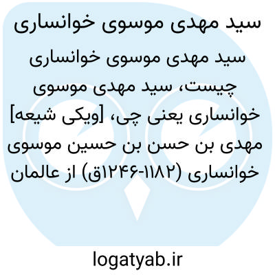 [ویکی شیعه] مهدی بن حسن بن حسین موسوی خوانساری (۱۱۸۲-۱۲۴۶ق) از عالمان شیعه در قرن ۱۲ و ۱۳ق. وی از شاگردان محقق قمی و از عالمان شناخته شده در خاندان خوانساری، پدر ابوالقاسم جعفر خوانساری، جد ابوتراب خوانساری و از بستگان صاحب روضات بود. خوانساری رساله مبسوطی درباره احوال ابوبصیر دارد که با عنوان عدیمة النظیر انتشار یافته است.