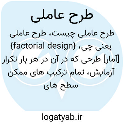 {factorial design} [آمار] طرحی که در آن در هر بار تکرار آزمایش، تمام ترکیب های ممکن سطح های عامل بررسی می شوند