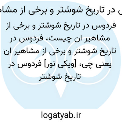 [ویکی نور] فردوس در تاریخ شوشتر و برخی از مشاهیر آن. فردوس، کتابی است به زبان فارسی که به موضوع تاریخ و جغرافیای شوشتر و نیز معرفی برخی از مشاهیر آن می پردازد.