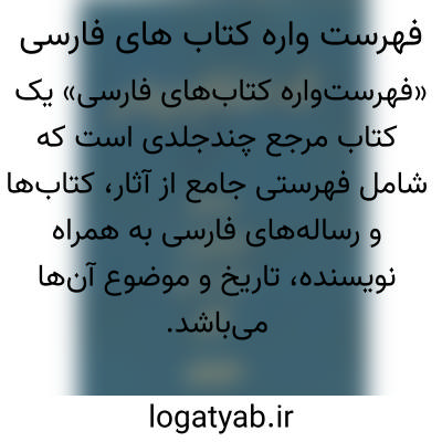 [ویکی فقه] فهرست واره کتاب های فارسی (کتاب). «فهرستواره کتاب های فارسی»، کتابی است به زبان فارسی که به فهرست کتاب های فارسی منتشر شده، از آغاز پیدایش زبان فارسی دری تا پایان چاپ سنگی می پردازد. هدف از نگارش این فهرستواره، تالیف کتاب نام های است از نگاشته های فارسی، بر حسب موضوع، و هر موضوع به ترتیب تاریخی، دربردارنده آگاهی های کتاب شناسی و نسخه شناسی.