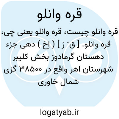 قره وانلو. [ ق َ رَ ] ( اِخ ) دهی جزء دهستان گرمادوز بخش کلیبر شهرستان اهر واقع در 38500 گزی شمال خاوری کلیبر و 38500 گزی شوسه اهر به کلیبر. موقع جغرافیایی آن کوهستانی و معتدل مایل به گرمی مالاریایی است. سکنه آن 67 تن. آب آن از چشمه و محصول آن غلات. شغل اهالی زراعت و گله داری، و صنایع دستی زنان گلیم بافی است. راه مالرو دارد. ( از فرهنگ جغرافیایی ایران ج 4 ).